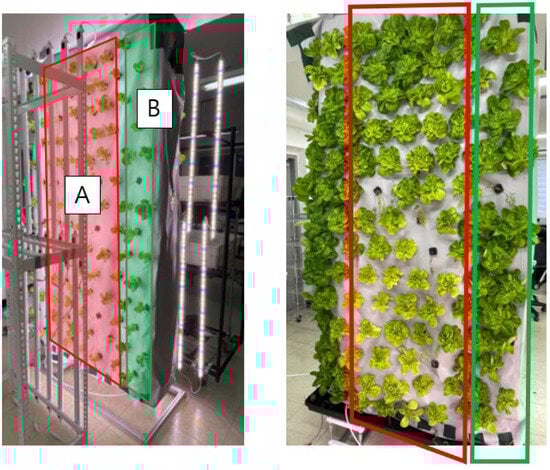 Representation of the difference in light supply quantity by color on one side of the vertical cultivation bed with installed artificial light in the vertical cultivator equipped with recirculation system. “A” Red indicates a relatively higher supply, while “B” green indicates a relatively lower supply of light.