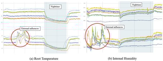 Monitoring system comparison graphs: These graphs demonstrated that, in the absence of external factors, the system maintains stable environmental conditions within the sealed system. The lines in different colors represent the data from six different growing beds.