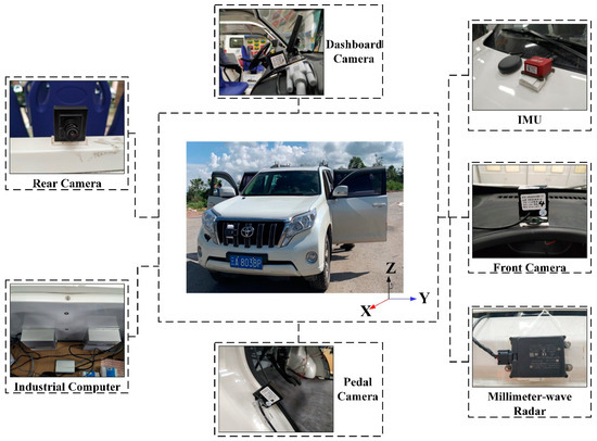 This study utilizes naturalistic driving data collected from 20 drivers, accumulating over 8000 km and more than 150 h of driving on mountainous roads in Yunnan Province, China. The chosen experimental routes include the G78 National Expressway and the G324 National Highway, among others. The naturalistic driving data collection system, as shown in Figure 2, includes the following components: