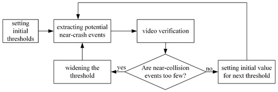 To identify and label near-crash events from the collected naturalistic driving data, inspired by Hankey et al. [25], we utilized a dual approach combining the threshold approach and manual video verification. The threshold approach not only aids in the extraction of relevant events but also supports the subsequent training of event identification models. The process of identifying near-crash events is illustrated in Figure 3, with initial threshold parameters during extraction as set by Dingus et al. [13]. Whenever the data at a specific moment align with any predefined threshold settings, a 5 s video record, capturing both before and after that moment, is further subjected to manual verification. Note that this dual labeling approach has its limitations, such as potential subjectivity in parameter selection and the possibility of missing some near-crash events. If a near-crash event is confirmed, it is labeled as 1; otherwise, it is labeled as 0. If the initial extraction yields too few events, the threshold would be relaxed to ensure a robust dataset. Table 1 outlines the initial threshold settings used for event selection.