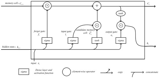 As shown in Figure 6, the used LSTM network typically features three control gates (forget gate, input gate, and output gate) along with a conveyor belt for carrying long-term memory. The operations of these gates are governed by Equations (7)–(12), ensuring control over the information’s entry, retention, and output within the network. Through these gating mechanisms, the LSTM network controls the extraction, discarding, and updating of historical information in a refined manner, thus maintains the network’s sensitivity to both short-term and long-term dependencies without succumbing to gradient issues [33].