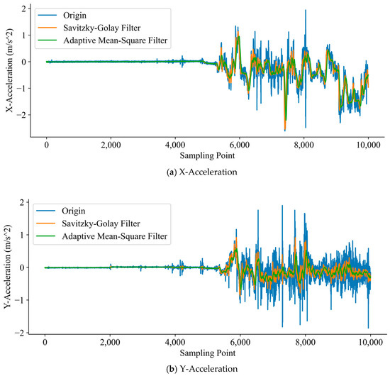In this study, an adaptive mean-standard deviation filter is first used to denoise the naturalistic driving data. Figure 7 shows a comparison between the SG (Savitzky-Golay) filter [38] and the adaptive mean-standard deviation filter. From the figure, it can be seen that the two filters can effectively filter out abrupt anomalous points, such as the upward and downward anomalies near sample point 8000. However, from an overall trend perspective, the SG filter adheres too closely to the original curve, only removing clearly abnormal points and being less effective for smaller anomalies. In contrast, the adaptive mean-standard deviation filter used in this study can effectively remove most of the anomalous points while smooth the data and preserve the characteristic information of the original signal.