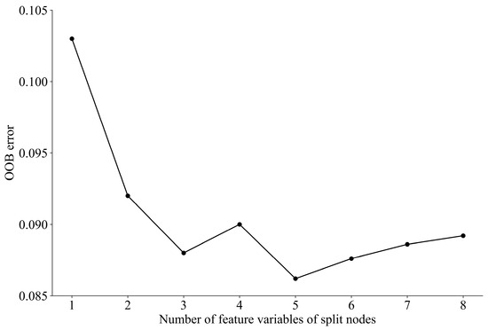 Next, the random forest algorithm is used for feature selection. The process begins by determining the optimal number of feature variables for splitting nodes in the random forest model based on the out-of-bag (OOB) error produced by the bootstrap samples that are not used in the model’s training. As shown in Figure 8, the out-of-bag error reaches its minimum value at 0.0862 when the number of feature variables is 5. Therefore, the number of node feature variables is set to 5. Hence, the number of decision trees in the random forest model is determined. As shown in Figure 9, the out-of-bag error gradually decreases as more decision trees are added, eventually plateauing beyond 300 trees. The random forest model is configured with 300 decision trees to ensure efficiency and accuracy in feature selection, which can strike a balance between computational resource use and predictive performance.
