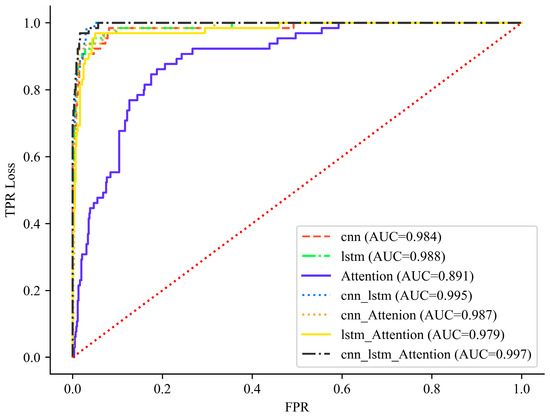 Table 6 shows the identification results of the CNN-LSTM-Attention model and the comparative models. Among them, the CNN-LSTM-Attention model achieves the highest overall accuracy (A) of 98.8%, and the AUC value reached 0.997. All models achieve over 95% accuracy in identifying normal events. However, in identifying near-crash events, the CNN-LSTM-Attention model performs best, with a precision of 90.1%, which is significantly higher than the 61.6% of the CNN model, 76.8% of the LSTM model, and 82.9% of the CNN-LSTM model. The recall rate (R) of the CNN-LSTM-Attention model is 98.5%, which is also superior to the performance of the other models. In all, the CNN-LSTM-Attention model achieve the best results in overall performance in identification of normal events and near-crash events. The model can identify more near-crash events with a lower false rate than the comparative models.