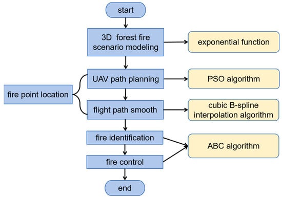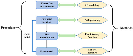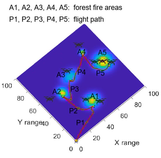 In order to simulate a real mountain forest fire scenario, a 3D mathematical model of the mountain forest based on the exponential function is set up first. Next, the particle swarm optimization algorithm is used for the UAV path planning to quickly locate the fire points. It should be noted that the constraints of UAV flight need to be met, and the cubic B-spline interpolation algorithm is implemented to smooth the UAV flight path. Then, the artificial bee colony algorithm is implemented to set up a mechanism for mountain forest fire point identification and control. In the mechanism, UAVs play different roles, and the methods of fire identification and control are proposed. Finally, a strategy for mountain forest fire detection based on UAV swarms is established to achieve fire point location, identification, and control. The setup procedure for the application strategy is illustrated in Figure 6.