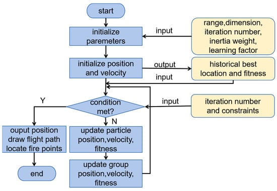 The procedure for mountain forest fire point location based on the UAV swarm path planning algorithm is illustrated in Figure 4. Firstly, initialize particle swarm parameters, such as the particle swarm size, dimension, number of iterations, inertia weight, learning factor, and so on. Secondly, randomly initialize the position and velocity of each particle, record the individual optimal position and the group optimal position, and calculate the fitness value of each particle according to Equations (4) and (8)–(10). Thirdly, check if the particle’s position complies with the stipulated conditions according to Equations (5)–(7). Fourthly, update the velocity and position of each particle according to Equations (2) and (3). Fifthly, update the historical optimal fitness value and position of each particle and the group until the iteration is completed. Finally, output the particle position and draw the UAV flight path diagram along with the mountain forest fire location.