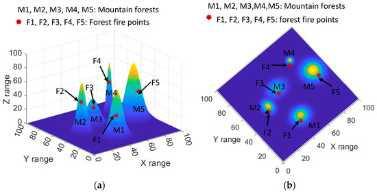 According to the modeling method described in Section 3.1, the models of mountain forests are configured as illustrated in Figure 7. As can be seen from the top view, five mountain forests with different heights and widths are constructed, the UAV flight range () is set from (0, 0, 0) to (100, 100, 100), and the fire points with different locations are specified on the mountain forest models. It should be noted that the characteristics of the modeled mountain forests and fire points are all randomly selected. The specific parameters of the modeled mountain forests and fire points utilized in the UAV swarm application strategy verification are detailed in Table 1.