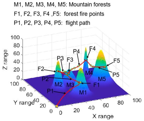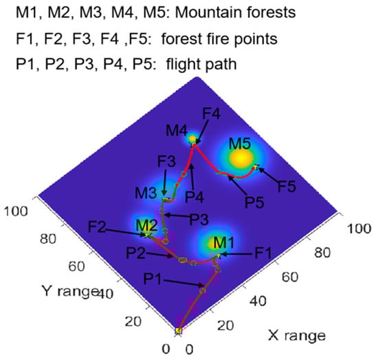 As shown in Figure 8, the UAV departs from the starting point (0, 0, 0), initially reaches Fire Point F1 at a relatively high position of the mountain forest M1, then proceeds to Fire Point F2 of the mountain forest M2, next proceeds to the Fire Point F3 at a relatively low position of the mountain forest M3, after that proceeds to the Fire Point F4 of the mountain forest M4, ultimately arriving at the Fire Point F5 of the mountain forest M5. As can be seen, the UAV flight path planning method realizes the detection of multiple continuous mountain forest fire points at different heights and locations. It is important to highlight that each path is connected by three location points, and all the paths successfully avoid the adjacent mountain forests. In order to show more detailed features of the method for detecting continuous multiple mountain forest fire points, Figure 9 illustrates the top view of the UAV flight path.