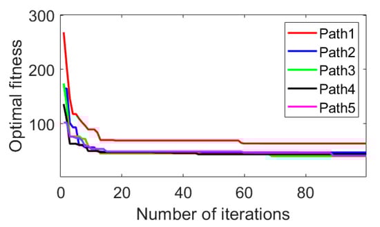 As depicted in Figure 9, the UAV flight paths P1, P2, P3, P4, and P5 are shown more directly, highlighting the details of the flight trajectory successfully bypassing the adjacent mountain forests. It is important to note that all optimal fitness can be obtained after 62 iterations of the PSO algorithm. The computation times of the flight paths P1, P2, P3, P4, and P5 are 13.3 s, 7.9 s, 9.1 s, 11.2 s, and 13.1 s, respectively. Figure 10 illustrates how optimal fitness evolves with the number of iterations. As can be seen, flight Path2 has the fastest rate of optimal fitness decline, flight Path3 and Path4 have the middle rate, and flight Path1 and Path5 have a relatively slow rate, aligning with the progression of optimal path adjustments.
