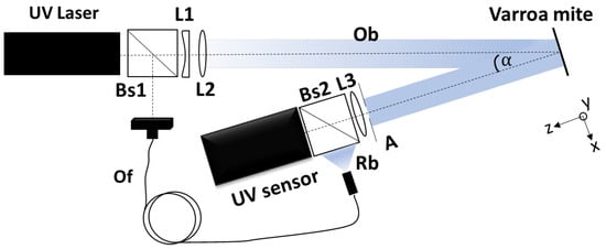 The experimental setup consisted of a laser beam with a wavelength of 355 nm, a pco.ultraviolet CCD camera, two 50⁄50 beam splitters, an optical fiber, and a set of UV lenses. The experimental setup is schematically shown in Figure 1. The laser beam was split into a reference beam (Rb) and an object beam (Ob) by a beam splitter (Bs1). The reference beam was directed into the optical fiber (Of) and transmitted to a second beam splitter (Bs2), which reflected 50% of the beam intensity toward the CCD camera. The object beam was collimated using special UV lenses (L1 and L2) and directed toward the specimen. The CCD camera collected the backscattered light at an angle of . A special UV lens (L3) and an aperture (A) in front of it were used to capture an image on the CCD camera.