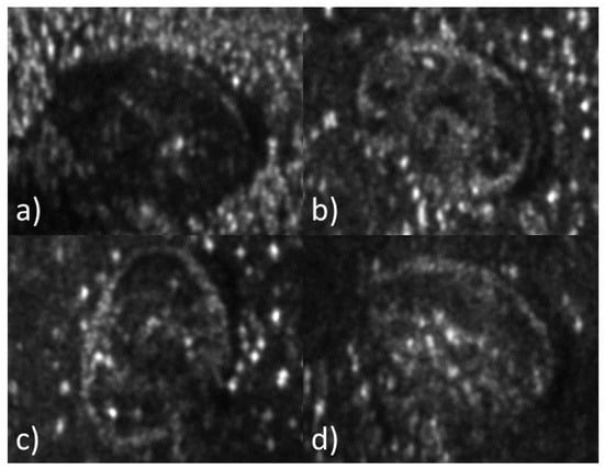 In Figure 3a–d, the amplitude of four holograms reconstructed through digital processing is depicted. In Figure 3a, it is observed that the mite reflects less intensity than its surroundings, suggesting the significant absorption of UVA radiation by the mite. To improve measurement results, attempts were made to reduce the reflection from the surroundings by adding a dark background and optimizing the exposure time (10 ms). The results are shown in Figure 3a–c.