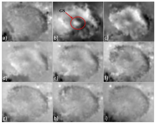 Figure 4 displays the first nine phase difference maps extracted from a series of holograms. Each of the images represents the phase difference between two consecutive holograms whose registration differs by a time corresponding to one dose of UVA irradiation (1.6 min). In Figure 4b, it is possible to observe a subtle but meaningful deformation around the mite’s genital shield (GS).