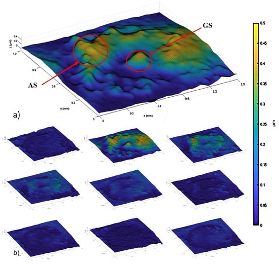 Figure 5a depicts the displacement map with the highest amplitude (approximately m). Areas enclosed by a red circle (referred to as anal shield (AS) and genital shield (GS) as designated in [18]) indicate regions of the Varroa specimen undergoing more pronounced swelling. Figure 5b displays the displacement maps extracted from the phase maps of Figure 4. These displacement maps show the progression of alterations in the mite over time. The difference in amplitude among the maps in Figure 5b suggests a deceleration of alterations after the third dose of irradiation.