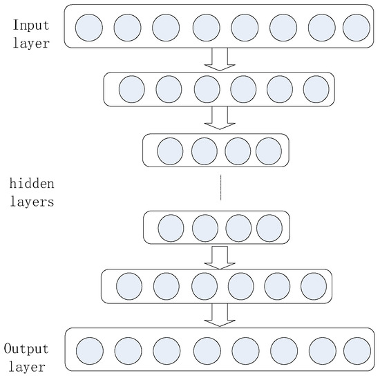 Recently, neural information network learning has achieved significant success in various applications, including image classification, speech recognition, and natural language processing. Collobert et al.’s research [21,22,23,24,25] made training in deep architectural structures possible and effective. One of the strategies employed in their research was the greedy layered unsupervised pre-training strategy, whose aim was to learn a useful representation layer by layer and then set the output features as inputs for the next layer. Each layer in this process involves some form of non-linearity, such as non-linear activation functions (e.g., sigmoid or tanh) or regularization of features (e.g., sparse constraints). By stacking these non-linear layers together, deep learning can be used to generate improved representations. The process from the input layer to the hidden layer is called encoding, and the process from the hidden layer to the output layer is called decoding, as illustrated in the model process in Figure 2.