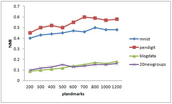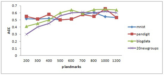 Experiments were conducted on the model, setting the landmark number parameter p from 200 to 1200, increasing in intervals of 100, with the derived ACC results as shown in Figure 4. From Figure 4, it can be seen that the ACC value increases with the change in landmark value, which is attributed to the random selection method. Evidently, having more landmarks can enhance the final ACC performance; however, the change was not found to be significant in our study. Figure 5 illustrates the relationship between the number of landmarks and NMI. The NMI value generally increases as the number of landmarks increases but with limited magnitude.