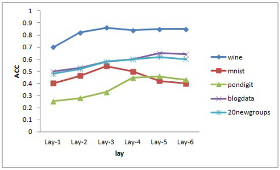 Examining the settings of the depth structure layer (lay), the ACC value of the first layer of on the dataset in Figure 6 was obtained by directly applying K-means to the input normalized sparse similarity graph. It can be observed from Figure 6 that as the layers become deeper, the ACC value increases. This suggests that deep structures play a crucial role in generating high-quality clustering results. In Figure 7, as the number of layers increases, the NMI values for large-scale datasets such as blogdata and 20 newgroup increase.