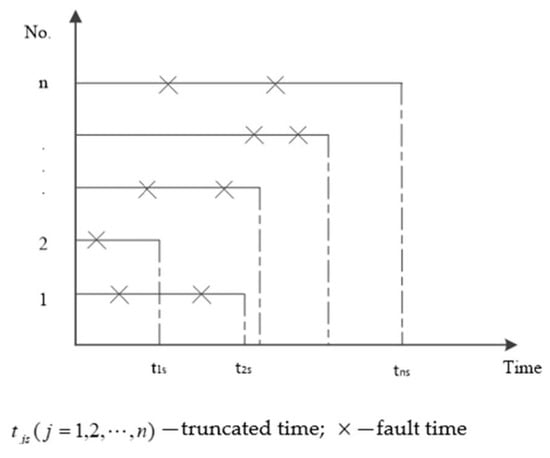 In order to save time and cost, many products use a random truncation test method for reliability testing. The characteristics of fault data under a random truncation test can be represented in Figure 1.