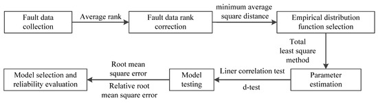 Regarding highly reliable and long-life products, most products do not fail at the end of the experiment, resulting in a large amount of truncated data and a small amount of fault data. The existence of truncated data directly affects the fault rank. Therefore, fault rank corrections are required. Meanwhile, considering the impact of empirical distribution functions on parameter estimations, the minimum average square distance is used to select the optimal empirical distribution function. The average square distance does not depend on the value of the fault samples and the optimal empirical distribution function can be selected from the perspective of the overall average. Under the assumption of the Weibull distribution model, the total least squares estimation method is introduced for parameter estimation. Then, linear correlation coefficient and d-test method are used for model hypothesis testing. If two or more distribution models pass the linear correlation coefficient test and the d-test simultaneously, the root mean square error and relative root mean square error are applied to determine the optimal reliability model. A flow chart of the reliability analysis of random truncation small-sample fault data is shown in Figure 2.