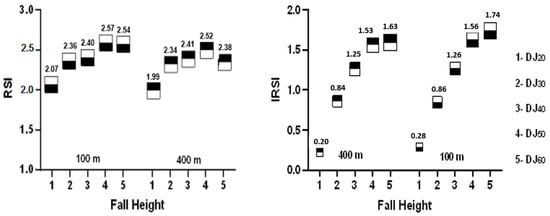 The RSI (left) and IRSI (right) for each drop jump obtained in 100 m and 400 m sprinters. The y-axis represents either the mean RSI or IRSI, and the x-axis represents the different drop jumps (i.e., fall heights) for both groups.