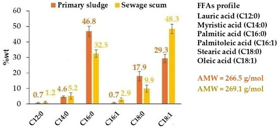 In primary sludge samples (E1–3), TS content was about 4%wt with a lipid content between 202.4 ± 6.1 mg/gTS and 244.3 ± 9.3 mg/gTS. Soaps were found to be the main component of the lipids isolated. In contrast, TS content in sewage scum samples (E4–9) ranged from 19.3 ± 0.5%wt to 32.0 ± 0.5%wt with a significantly higher lipid content of 350.1 ± 8.4 mg/gTS–502.4 ± 1.5 mg/gTS. Lipids consisted mainly of FFAs (47.5 ± 0.8%–59.5 ± 1.9%) and soaps (27.3 ± 1.9%–34.5 ± 1.0%). The different chemical nature of the lipids in primary sludge and sewage scum made it necessary to optimize the lipid recovery for each feedstock typology. The recovery of lipids from primary sludge, consisting mainly of calcium soaps (>70%), was achieved by extraction with hexane from acidified wet primary sludge with a recovery rate of 99% [53]. In the case of sewage scum, heating wet biomass at 80 °C and directly centrifuging it (4000 rpm, 3 min) allowed the extraction of lipid components with a recovery of 92–99%, without the addition of solvents or acids [54]. Subsequently, recovered lipids were activated by adding the stoichiometric amount of HCOOH to calcium soaps, thus obtaining their conversion into FFAs. The chemical composition of FFAs extracted from primary sludge and sewage scum is shown in Figure 2.