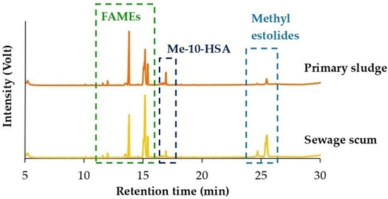 Primary sludge and sewage scum were taken from several WWTPs in the Apulia region of southern Italy. After a preliminary determination of TS content, raw lipids were extracted from sewage sludge samples, quantified and chemically characterized (see Supplementary Materials of Section S.2). The results obtained are shown in Table 1.
