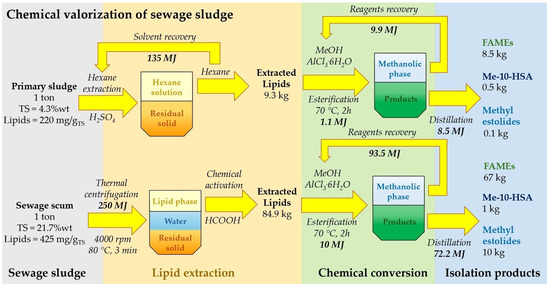 In this work, a detailed analysis of the lipid component in primary sludge and sewage scum up-taken from several wastewater treatment plants located in southern Italy was carried out. Lipids in the primary sludge accounted for 200–250 mg/g of the total solids (TS), with calcium soaps as a main component (70–82%), while total lipids made up about 350–500 mg/gTS in the sewage scum and consisted mainly of FFAs (45–60%) and calcium soaps (27–35%). In addition, estolides and 10-hydroxystearic acid were also quantified. A specific valorization process was then developed and tested for either primary sludge or sewage scum. In detail, lipids were first recovered, chemically activated by the addition of acids (calcium soaps were converted to free fatty acids) and finally reacted with methanol to obtain methyl esters. The lipid recovery from primary sludge and sewage scum was particularly efficient (recoverability of 92–99%). The conversion of the starting acids into FAMEs (yield > 98%) was achieved under very mild conditions (70 °C, 2 h) with AlCl3·6H2O as a catalyst. Biodiesel (according to EN14214), methyl 10-hydroxystearate and methyl estolides were efficiently isolated by distillation under vacuum. Finally, a feasibility study of the proposed processes was carried out to evaluate their possible integration into a wastewater treatment plant, critically analyzing both the positive aspects and the relative limitations.
