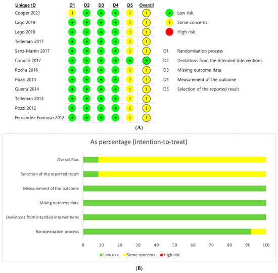 Risk of bias. (A) Summary of the risk of bias in the included studies [12,13,14,15,16,17,18,19,20,21,22,23]. (B) Overall risk-of-bias score for each field.