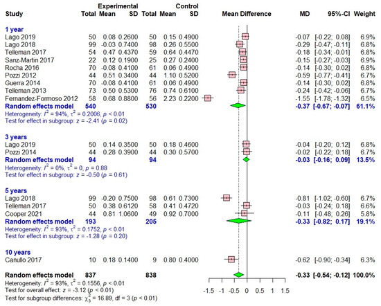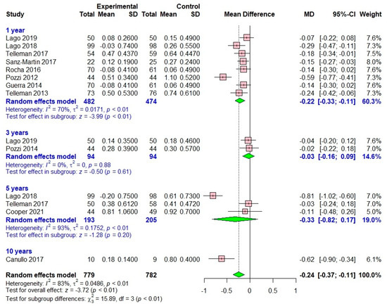 Taking into account the diverse range of subjects, research backgrounds, and research periods, a random-effects model was employed. Furthermore, the high level of I2 values (87%; p < 0.01) indicated substantial heterogeneity among the studies. To account for this heterogeneity, a subgroup analysis was performed, dividing the literature into four subgroups based on the loading time frame: 1 year, 3 years, 5 years, and 10 years. Given the considerable heterogeneity among the studies, the between-study variance was not assumed to be equal in the meta-ANOVA analysis (Version 3.5.0; R Project for Statistical Computing).