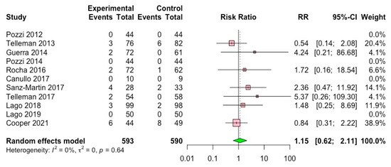 The forest plot of meta-analysis on implant failure showed an insignificant difference between PS and PM implants (Figure 4). A random-effects model was applied, and a low level of the I2 values (0%; p = 0.64) indicated insignificant heterogeneity among the studies.