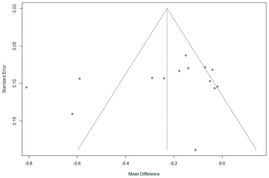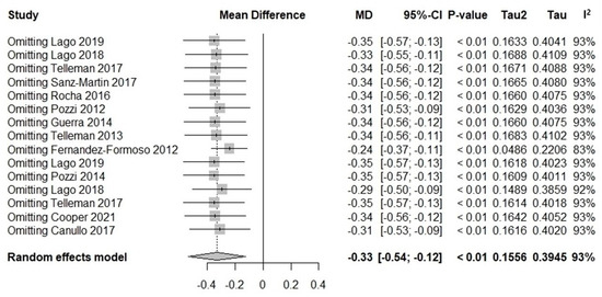 A sensitivity analysis was performed by excluding a single study (Fernandez-Formoso et al., 2012 [23]) from the total of 12 studies on MBL, which was found to affect the aggregate outcomes of the meta-analysis (Figure 5). A high level of the I2 values (75%; p < 0.01) indicated significant heterogeneity among the studies (Figure 6). The results of the meta-analysis showed that the pooled MD of reducing MBL in PS implants compared with PM implants were −0.46 (95% CI, −0.66 to −0.25; p < 0.01). The test for overall effect is significant (p < 0.01), and it also revealed that there were significant differences between subgroups (p = 0.02).