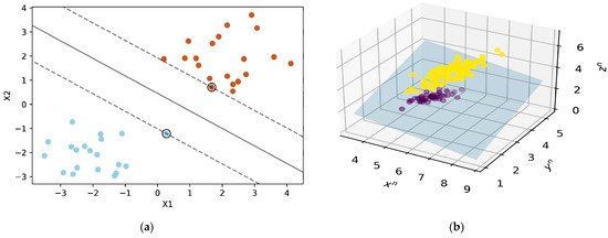 Schematic diagram of support vector machine classification. (a) two-dimensional space; (b) higher dimensional space.