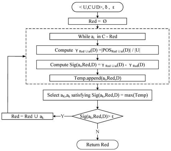 The reduction process is roughly described: the reduction set starts with the empty set, each time adding an attribute to the reduction set and calculating the attribute importance of the temporary reduction set after adding the attribute . From these temporary reduction sets, the set with the greatest attribute importance is selected. Judge whether the maximum attribute importance is greater than the importance threshold set by us. If it is, add the attribute to the collection and update it; if it is less than or equal to , exit the program.