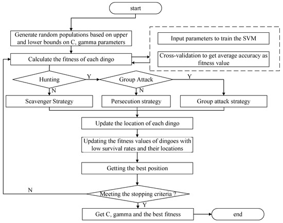The penalty factor C and the kernel parameter gamma in the Support Vector Machine (SVM) model have a large impact on the computational accuracy, and the selection of appropriate C and gamma parameters has a great effect on the computational results of the model. In this section, according to the characteristics of the dingo algorithm, which offers dynamic search capabilities and avoids settling for local optimal solutions easily, the C and gamma parameters of SVM are optimized, and the specific optimization steps are as follows. The DOA-SVM Flowchart is shown in Figure 3: