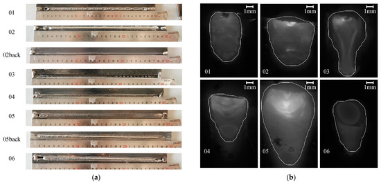 The literature in [22] mentions a close relationship between weld quality and melt pool image features. Therefore, this paper presents melt pool images of porosity, incomplete penetration, burned-through, under-welded, good, and weld deviation. These images and their corresponding welds, as shown in Figure 5, were obtained by building a welding platform and designing experiments to simulate ship welding. From the physical weld images, it can be seen that each defect has a distinct appearance, 01 displays obvious porosity; 02 appears similar to other defects from the front view, but the back view clearly shows no melt-through; 03 is clearly distinguishable from others, exhibiting signs of leakage and perforation; 04 shows a minor groove with the weld positioned below the workpiece when viewed from the back; 05 has the weld not below the workpiece from the front view, while the back shows some residual height and width; 06 shares similarities with other weld surfaces, but it can be differentiated as the weld is not centered within the gap. From the molten pool image, the shapes of these states are still somewhat differentiated, where the area of 05 is more round and full here, and the shape of 03 is gourd-like. By counting their appearance characteristics and shape features, the welding defect information system can be effectively enriched to provide a basis for automatic defect recognition. From the grey-level map of different states, the grey-level distribution varies across intervals. Thus, grey-level statistics can serve as a valuable addition to the defect information system.