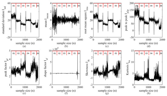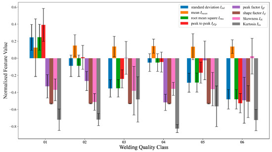To delve deeper into these issues, we extracted eight data features from the actual current values, including standard deviation , mean , root mean square , peak-to-peak , peak factor , shape factor , skewness , and kurtosis . We then compared these characteristics with the actual current values of a normal (good) weld. As shown in Figure 8 and Figure 9, we found that when there are problems such as porosity, under-welding, burn-through, under-welding, weld deviation, etc., their time-domain features are somewhat different compared to the eigenvalues of the ideal weld, which can be used as classifying features for defect identification.