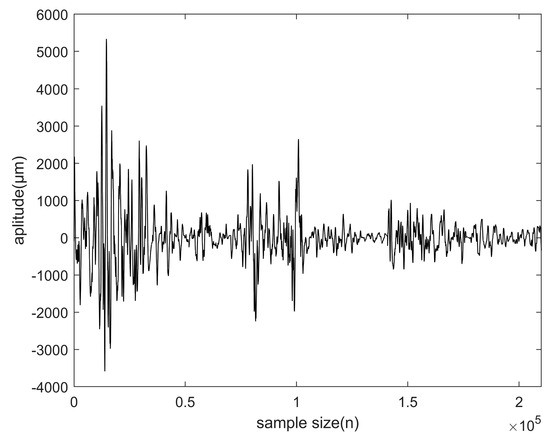 This helps in extracting the statistics of the vibration amplitude signals in the original X, Y, and Z directions. The statistical time-domain features of the signals with vibration amplitude in three directions are 16 dimensions, which are variance, maximum, peak, root-mean-square, absolute mean, peak indicator, skewness, waveform indicator, minimum, impulse indicator, margin indicator, square root magnitude, skewness indicator, mean values, and crag metrics. Since there are 16-dimensional features in one direction, combining the features from all 3 directions results in 48-dimensional features. For example, Figure 10 shows the time-domain waveform of the X-axis after removing the DC component and wavelet thresholding noise reduction.