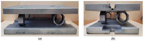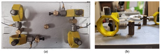 For force determination, force transducers were used; four force transducers made by Brüel & Kjær, type 8230-003, were mounted on the rings (Figure 3a); at one end, they were fixed to the rings, and at the other end, they were locked by means of stops embedded in the bottom plate (Figure 3b). The main characteristics of the used force transducers are presented in Table 1 [].
