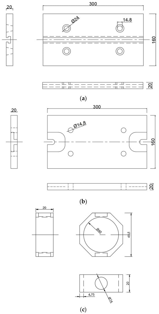 Geometry of the dynamometer components (the dimensions are given in mm): (a) ring geometry; (b) upper plate geometry; (c) bottom plate.