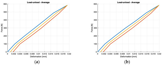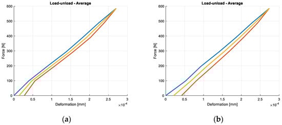 We conducted 10 loads and unloads for each case using plates with a known mass. The values for each deformation at a certain load were averaged, and average values for both the load and unload were calculated. As can be seen from Figure 3, in both cases, in the case of unloads, there is a residual deformation.