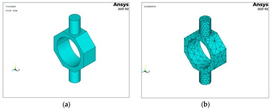 The third method used simulated the stiffness using the finite element method []. The stiffness based on the FEM was measured considering the tools given by the program ANSYS Mechanical APDL. The 3D geometry of the ring was built using the module for modeling from the pre-processor step (Figure 7a).