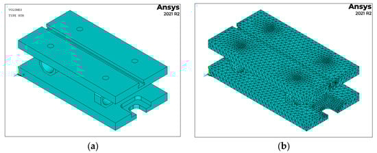 The 3D model of the dynamometer was created using the same program ANSYS—Mechanical APDL 2021 R2. The base and upper plates and the rings were modeled (Figure 12a). For the finite element model, the same type of element as in the case of the ring was used. The FE model consists of 9661 nodes and 21,131 elements (Figure 12b).