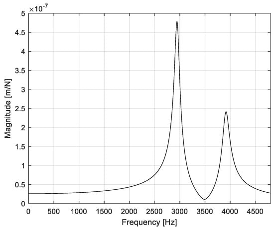 Based on the obtained values for natural circular frequencies, the model components (mass, damping, and stiffness), considering the superposition principle, are plotted as an FRF for the considered dynamometer (Figure 16).