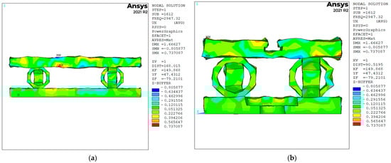The mode shapes for a frequency of 2947.32 [Hz]: (a) deformation in longitudinal direction; (b) deformation in transverse direction.