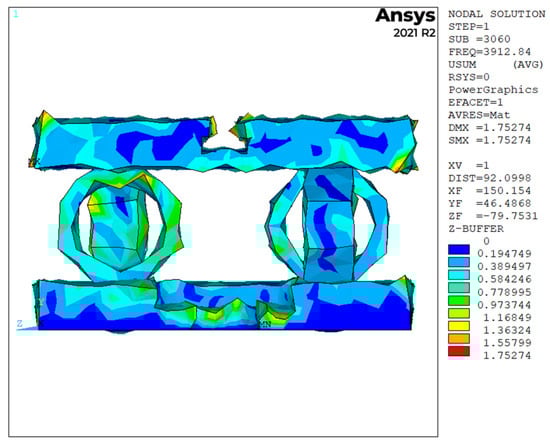 Based on the values presented in Table 2, the average value for stiffness in the transverse direction is kFEM_tr = 29.041 × 106 [N/m]. The deformed shape in the case of longitudinal load is presented in Figure 9.