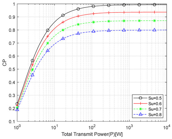 used for transmitting information in the first stage increases, and the channel capacity for effective information transmission increases; therefore, the connection probability shows an upward trend. When the total transmit power continues to increase, the channel capacity for effective information transmission tends to be close to the maximum transmission capacity, so the connection probability value of CP tends to stabilize. When the total transmit power