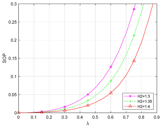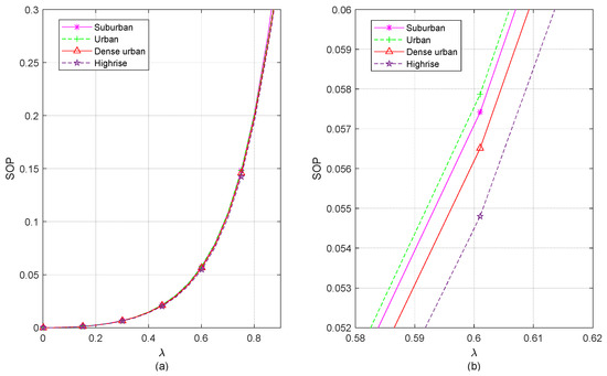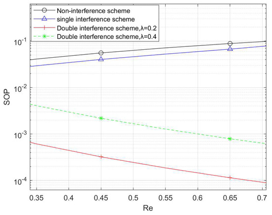 Figure 6, it can be seen that the system’s secrecy outage probability is minimized in the environment of a high-rise city. This is because in the environment of high-rise buildings, the fading of the system will increase, but at this time, the interference signal sent by the UAV relay node U to the UAV eavesdropping node E belongs to the high-altitude transmission, which is less affected, so the eavesdropping channel capacity will become smaller, the SOP of the system decreases, and the security of the system is enhanced.