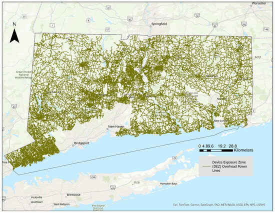 Our study area is Eversource Energy’s service territory in the state of Connecticut (CT). Eversource Energy (EE) maintains more than 28,000 km of overhead distribution lines across CT and contains nearly 49,000 device exposure zones (DEZs—the outage locations correspond to isolating devices, each of which protects a section of the power line called a device exposure zone). The average length of a DEZ is approximately 500 m. EE distributes electricity across 149 towns in CT, serving nearly 1.2 million customers. CT’s land cover varies from urban areas in central and southwestern CT to the forested areas of eastern and western CT and its southern coastal landscape (Figure 1).