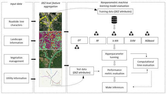 The proposed VRM [19] is a tree-related outage probability assessment tool that comprises roadside tree characteristics, vegetation management information, utility infrastructure, and power outage data across the EE service territory in CT (Table 1). The predictor variables for the VRM were selected by considering the existing literature on various machine learning distribution network outage prediction models [5,11,18,19]. All of the input variables were extracted, aggregated, and averaged at the DEZ level. The following subsections explain each component of the ML model comparison process (Figure 2).