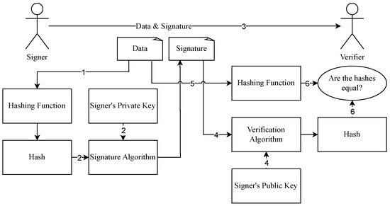 Digital signatures are one of the fundamental applications of asymmetric cryptography. Digital signatures ensure the non-repudiation of data and its integrity. In order to create a signature, several elements are necessary: a private key, a signature algorithm, and usually, a hash function. A scheme of digital signature is presented in Figure 1. Firstly, the hash is computed (1) to sign a file—this process is not obligatory but supports efficiency of signature process. Subsequently, the signature algorithm is used. Its inputs are the hash of the file to be signed and the private key of the signer (2). The result of this action is a signature that proves the undeniable authorship of the file. This collection—original data and signature—is sent to the recipient (3).