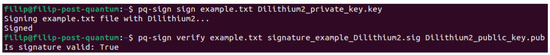 The implemented application can sign a selected file and verify digital signatures using post-quantum algorithms. Its main functionality is based on the pq-sign command, which can be used in the terminal. An example of the sign and verification process is presented in Figure 2. An important function is generate-keypair, which generates a private key used to sign documents and a public key, which can be used to verify signatures. The sign command is a central feature of the application—it lets users digitally sign documents, ensuring their authenticity and integrity. Verification of the digital signature is carried out with the pq-sign verify command. Additionally, the pq-sign ls command has been designed to provide a comprehensive list of all post-quantum cryptographic algorithms currently supported by the application.